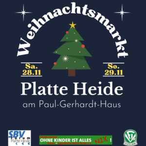 Weihnachtszauber am Paul-Gerhardt Haus! 🎅❄️ Der 37. Weihnachtsmarkt auf Platte Heide öffnet vom 28. bis 29. November seine Pforten. Genießt handgemachte Schätze, kulinarische Leckerbissen und eine bezaubernde Atmosphäre.